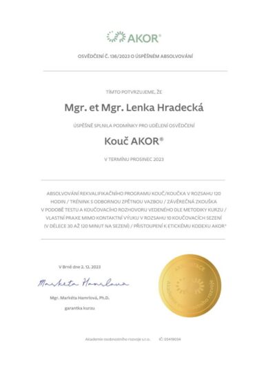 Kurzy s certifikací AKOR® stojí na myšlence, že dobrého kouče z vás udělá pouze trénink. Poskytneme vám veškeré znalosti a podporu, abyste mohli svůj talent rozvinout a vaše praxe byla úspěšná.